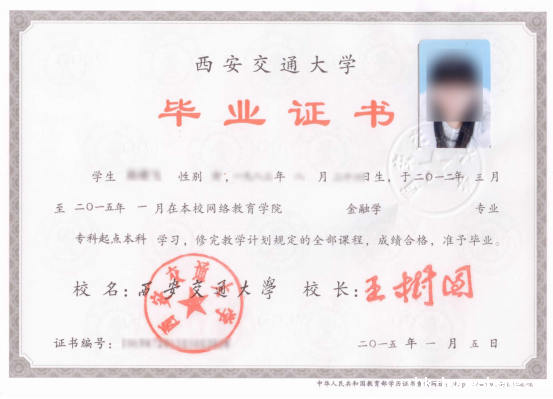 凡在学习期限内完成教学计划规定的全部课程,经考核成绩合格,取得该专业全部学分者(专升本层次学生毕业前必须通过教育部规定的部分公共基础课全国统一考试(大学英语B和计算机应用基础),符合教育部(教高〔2004〕5号)文件免考条件的可免考),准予毕业并颁发国家承认学历的西安交通大学毕业证书(加注“网络教育”字样),教育部予以电子注册。本科学生在读期间或符合资格的本科毕业生一年内可申请参加学位英语考试,毕业生符合《中华人民共和国学位条例》、陕西省学位办及西安交通大学有关成人学士学位授予规定者,可授予成人学士学位。![]()
