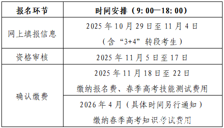春季高考报名分为网上填报信息、资格审核、确认缴费等3个阶段。具体时间安排如下: